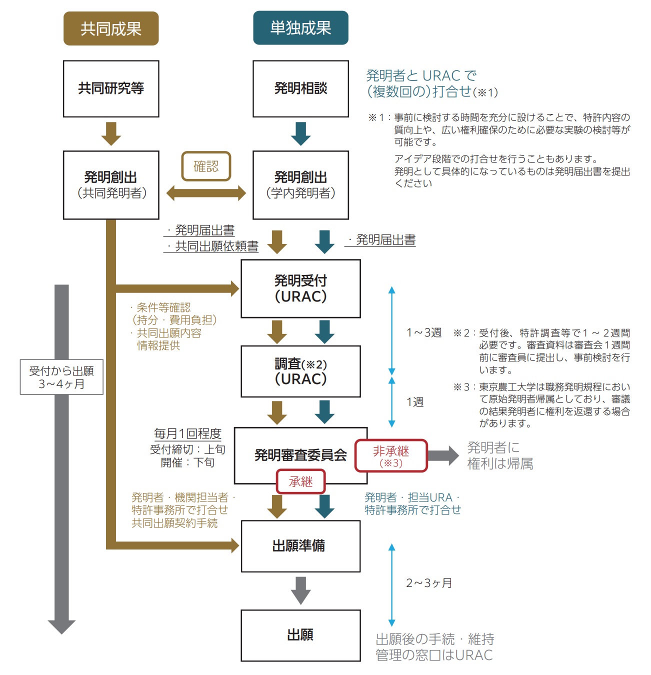 知的財産の届出・権利化の流れを紹介しています。以下の記載は、本学の発明者向けに特許取得プロセスを平易に解説することを目的としています。用語等はなるべく正確を期するようにしていますが、より詳細をお知りになりたい場合は、日本国特許庁のHP等をご参照ください。